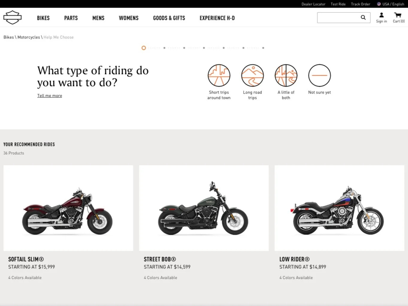 In order to help our users find the bikes that are the best match for them, I created the “Help Me Choose A Harley-Davidson” app. After answering a series of questions on riding style and preferred riding position, the answers are scored and applied to bikes that shared the selected attributes.